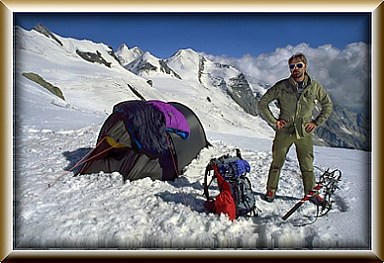 Zeltplatz am Südhang des Breithorns in 3900 m Höhe (Wallis, Schweiz) 1991. Die Nacht war mit -7°C auch recht frisch und abenteuerlich. |