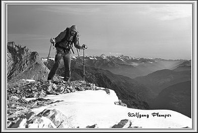 Gipfelstürmer: Ganz oben. Am Äußeren Barrhorn mit Blick ins Berner Oberland (Schweiz) 1990. Es war an diesem Tag ziemlich stürmisch, deshalb seh' ich da ein wenig gequält aus. |