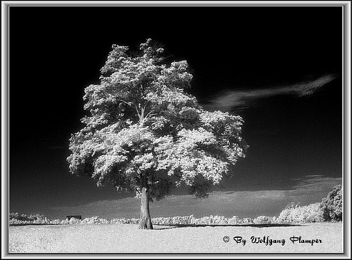 Baum im Infrarotlicht auf Kodak Hie. Besitzt man keinen geeichten Infrarotbelichtungsmesser, dann bleibt einem nur eine Belichtungsreihe übrig. Nach der Entwicklung sucht man sich die beste Aufnahme aus, das spart zwar kein Filmmaterial, bringt aber gute Ergebnisse. |